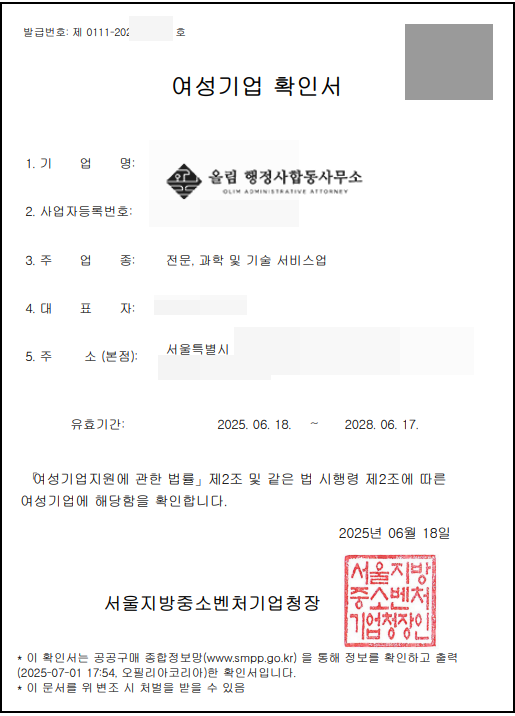 최근에도 신규 사업을 준비하시는 대표님께서 여성기업확인이 필요하셨는데 소개를 통해 업무를 맡기셨습니다.